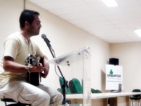 Professora Ana Boessio fez a abertura do Sarau, seguida pela apresentação musical de Jorge Azambuja, egresso do curso de Pedagogia do Campus Jaguarão