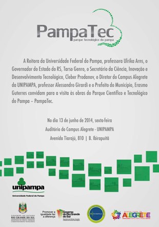 O Parque Científico e Tecnológico do Pampa (PampaTec) da Universidade Federal do Pampa (UNIPAMPA) receberá a visita do governador Tarso Genro e do secretário da Ciência, Inovação e Desenvolvimento Tecnológico (Scit), Cleber Prodanov, nesta sexta-feira (13), às 14h. Sediado no Campus Alegrete, o complexo do PampaTec encontra-se em construção desde o início deste ano. A implantação da estrutura recebe recursos do Governo do Estado no âmbito do Projeto RS Tecnópole e da Universidade, e abrigará dez novas empresas de base tecnológica no modelo de incubadora de negócios, quando o projeto estiver concluído. O PampaTec visa o desenvolvimento científico, tecnológico, social e econômico do Rio Grande do Sul e a promoção do empreendedorismo inovador no interior do Estado ao ofertar estrutura física inicial e acompanhamento técnico para que ideias e projetos tornem-se empresas. “É um marco histórico na ciência e tecnologia do Estado ter o PampaTec, pois é o ponto mais avançado do RS, geograficamente, onde se leva inovação e desenvolvimento tecnológico”, exalta o titular da Scit, Clever Prodanov. Conforme destaca o coordenador do Parque, administrador Émerson Rizzatti, por meio do PampaTec os projetos já pré-incubados e outros poderão se tornar empresas “para atuar no mercado, gerar renda, empregos e impostos, sendo uma oportunidade para que os egressos da UNIPAMPA não tenham como única alternativa procurar empregos em outras regiões do País”. O projeto para implantação do Parque foi aprovado no âmbito da Chamada Pública número 01/2011 e vinculado às ações do Programa Gaúcho de Parques Científicos e Tecnológicos (PGTEC). O Governo do Estado está investindo R$ 930.938,50 na construção, e a UNIPAMPA já investe R$ 755.795,75 na obra. “Este valor supera em R$ 687.384,05 o acordado inicialmente no convênio [em função da atualização de valores e necessidade de adaptações do entorno]. Isso mostra o quanto a Universidade acredita e investe neste projeto”, avalia Rizzatti. Além da construção dos três módulos do prédio do PampaTec, o convênio ainda prevê a realização de workshops, seminários e palestras para atrair interessados em ingressar no Parque com projetos empresariais inovadores e para promover a cultura empreendedora na comunidade regional. Atualmente, estão pré-incubadas quatro empresas: EGE - Geração de Energia Elétrica distribuída; Bolsa Startup - Plataforma de bolsas para projetos de desenvolvimento de software em estágio inicial; 4Leds - Desenvolvimento de produtos com tecnologia de lâmpadas Leds e circuitos "inteligentes"; AeroPampa - Veículo Aéreo Não Tripulado para monitoramento de áreas rurais. Investimentos: • Governo do Estado: R$ 930.938,50 • UNIPAMPA: R$ 755.795,75 Total: R$ 1.686.734,25 Conheça mais em www.pampatec.unipampa.edu.br |