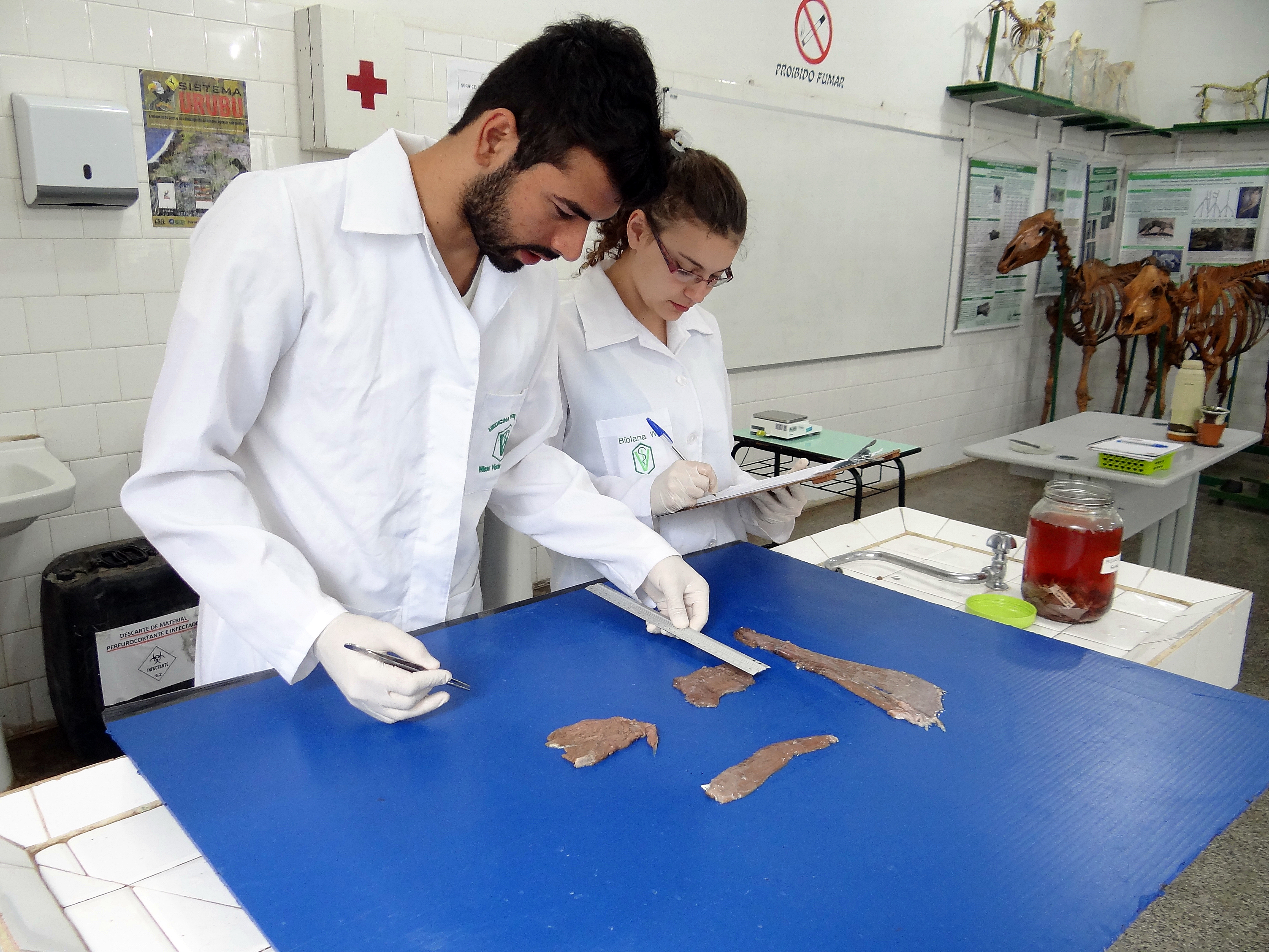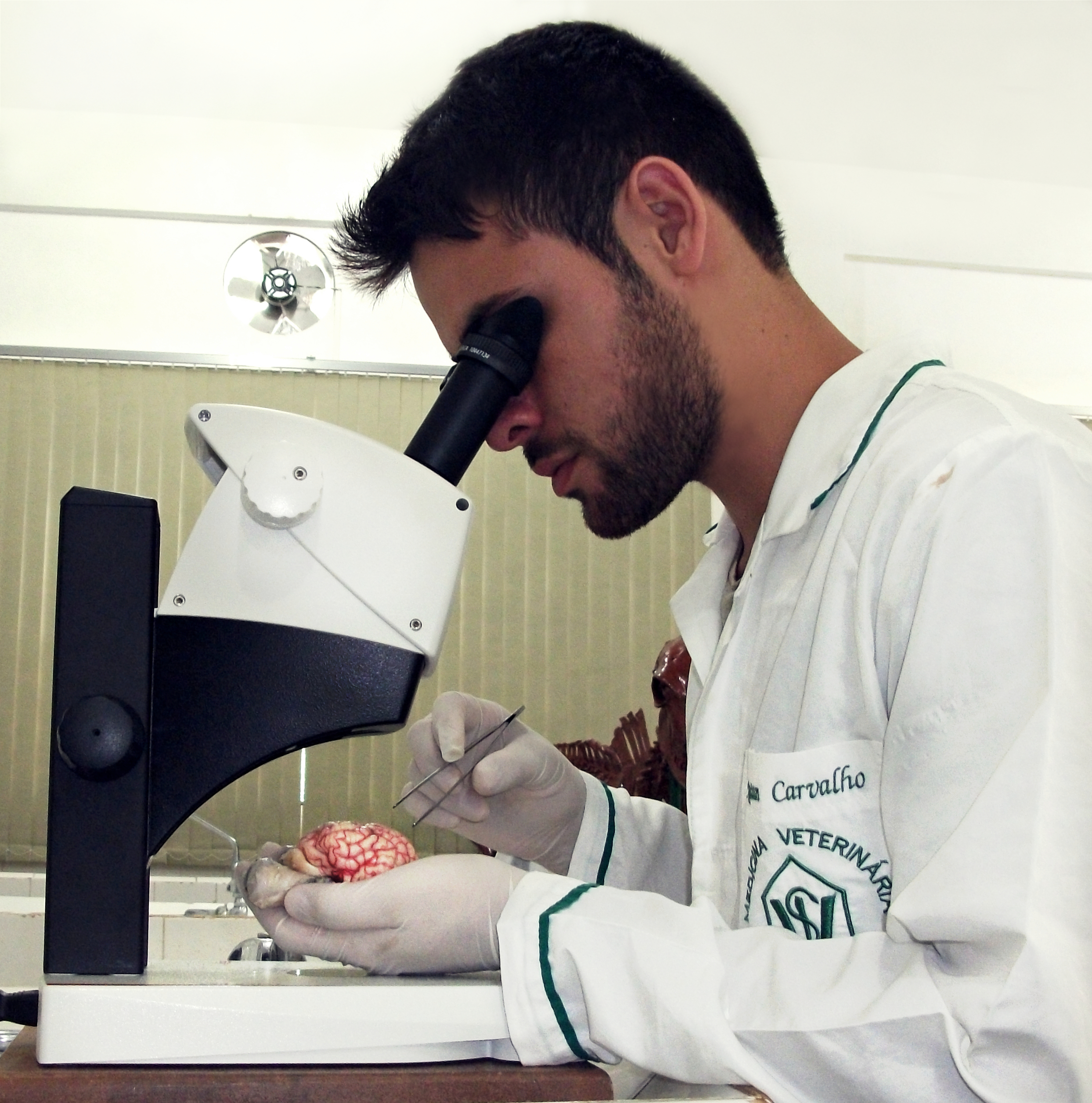 Acadêmico Natan da Cruz Carvalho analisa o encéfalo Resultados já compartilhadosO trabalho desenvolvido até o momento já permitiu a publicação de papers e a participação em eventos científicos para compartilhamento dos resultados. As apresentações desvendaram, por exemplo, particularidades dos sistemas locomotor e digestório de espécies como o Cerdocyon thous (graxaim-do-mato), Lycalopex gymnocercus (graxaim-do-campo), Alouatta guariba (bugio-ruivo) e Athene cunicularia (coruja-buraqueira). Um trabalho sobre a montagem de esqueletos como ferramenta no processo de ensino-aprendizagem em Anatomia Animal para discentes do curso de Medicina Veterinária também foi apresentado durante XXVI Congresso Brasileiro de Anatomia. Os alunos foram orientados pelos professores Paulo de Souza Junior e Amarílis Díaz de Carvalho e participaram dos seguintes eventos: VII Encontro sobre Animais Selvagens - II SImpósio sobre Medicina e Conservação da Fauna do Cerrado, Uberlândia, MG; 41o. Congresso Brasileiro de Medicina Veterinária, Gramado, RS; XXVI Congresso Brasileiro de Anatomia, Curitiba, PR; XVI Congreso de Anatomía del Cono Sur, Corrientes, Argentina. Os trabalhos publicados com os resultados das pesquisas podem ser acompanhados na lista de links abaixo: