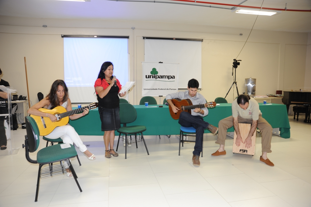 Os encontros presenciais do Pacto Nacional pelo Fortalecimento do Ensino Médio (PNEM) realizados pela Universidade Federal do Pampa (Unipampa) se encerraram nesta quarta-feira, 10, com a sensação de até breve. Todos os participantes da cerimônia de encerramento das ações presenciais, realizada no auditório do Campus Bagé, manifestaram a intenção de que a aproximação entre escolas e Universidade continue em 2015, ativando a rede colaborativa formada pelo Pacto em 2014, e atuando dentro e fora dos projetos e programas governamentais. “Encerramos os encontros presenciais, mas não nosso compromisso com a formação continuada, a articulação em rede e a formação com as escolas”, salientou a coordenadora institucional do PNEM, professora Claudete Martins, durante o painel de fechamento. Claudete afirmou que o momento de avaliação e reflexão das ações também vinha reafirmar e comemorar as conquistas alcançadas, “além de reafirmar e manter nossos vínculos”. No mesmo sentido, o coordenador do Comitê Gestor Institucional de Formação Inicial de Profissionais do Magistério da Educação Básica (Confor/Unipampa), professor Alessandro Bica, expressou seu desejo de “que o Pacto tenha mexido e que o planejamento de 2015 [nas escolas] comece diferente; que este seja o início de uma longa caminhada e que na universidade não se faça apenas pesquisa, mas sim ensino junto às escolas”, salientou. O encontro foi pontuado de apresentações artísticas, inclusive com a apresentação de uma música composta especialmente para o Pacto da Unipampa e tocada e cantada pelos professores Carla Leopardo e dos discentes Carla Daneris e Márcio Costa, do curso de Música, e pela alegria da convivência e dos relatos de fortalecimento obtidos ao longo da jornada. ![]() A pró-reitora de Graduação, professora Elena Billig Mello, avaliou que “este trabalho colaborativo trouxe os princípios da interdisciplinaridade e da contextualização dos saberes”. A pró-reitora de Extensão e Cultura, professora Vera Medeiros, expressou que “o êxito desta rede [entres escolas, CRE e Unipampa] é especialmente importante para nós na Universidade, que carecemos da interação com a comunidade, com nossa razão de existir. Nosso desafio primeiro é que a rede se mantenha entre as nossas instituições de ensino, para além de projetos e programas”. ![]() Professora relata movimentação na escola, sentida até mesmo pelos alunos (fotos: Aline Reinhardt/ACS Unipampa) Depois de ouvir o relato de professores a respeito da sensação de retomada de seu protagonismo no processo de ensino e aprendizagem na escola, a reitora Ulrika Arns anunciou que a continuidade do Pacto no próximo ano está garantido no orçamento da Unipampa, e que o foco é “ampliar e fortalecer o trabalho feito por vocês”. “Há algo que ninguém pode tirar de nós: nossa capacidade de criarmos uma rede efetiva entre instituições. Nossa formação continuada está apenas começando”, comentou Ulrika. |