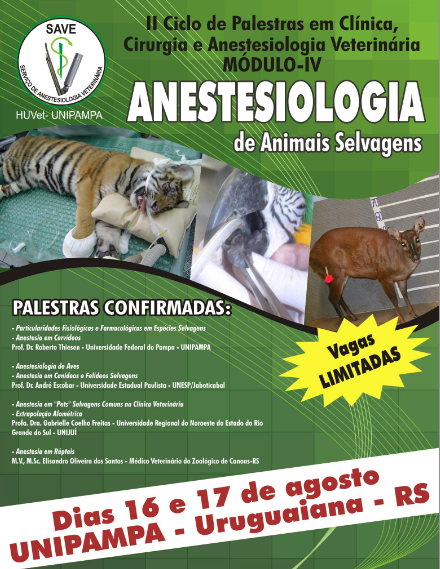 O módulo IV do II Ciclo de Palestras em Clínica, Cirurgia e Anestesiologia Veterinária – Anestesiologia de Animais Selvagens, irá acontecer nos dias 16 e 17 de agosto, no Salão de Atos do Campus Uruguaiana da Universidade Federal do Pampa (UNIPAMPA).