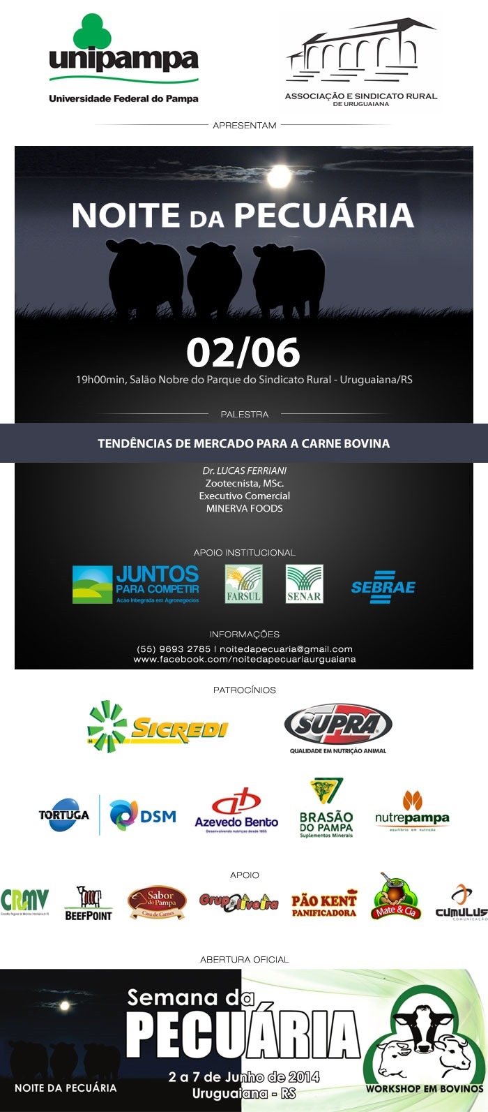 Na programação está prevista a 5ª Noite da Pecuária, no dia 02 de junho no Salão Nobre do Parque do Sindicato Rural de Uruguaiana (Pastoril). Nesta edição o Dr. Lucas Ferriani, da Minerva Foods, palestrará sobre Tendências de mercado para a carne bovina. Mais informações através do e-mail: